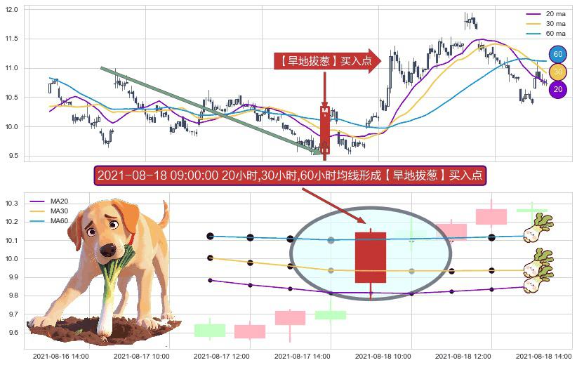⚀ 2021-08-18 09:00:00小时显现 20小时-30小时-60小时均线 【旱地拔葱】买入点 看多信号,后市看涨,买入