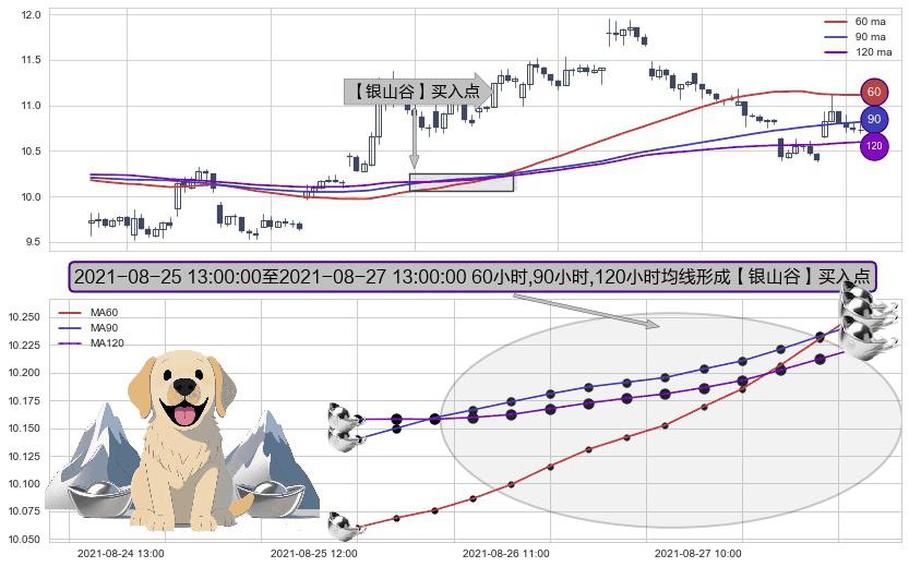 ⚀ 2021-08-25 14:00:00-小时至2021-08-27 13:00:00-小时显现 60小时-90小时-120小时均线 【银山谷】买入点 看多信号,后市看涨,买入