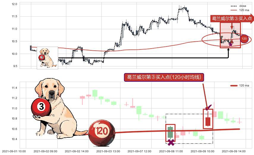 ⚀ 2021-09-09 09:00:00-小时显现 葛兰威尔均线 120小时均线 第③买入点 上升趋势的中继信号,后市看涨,买进信号