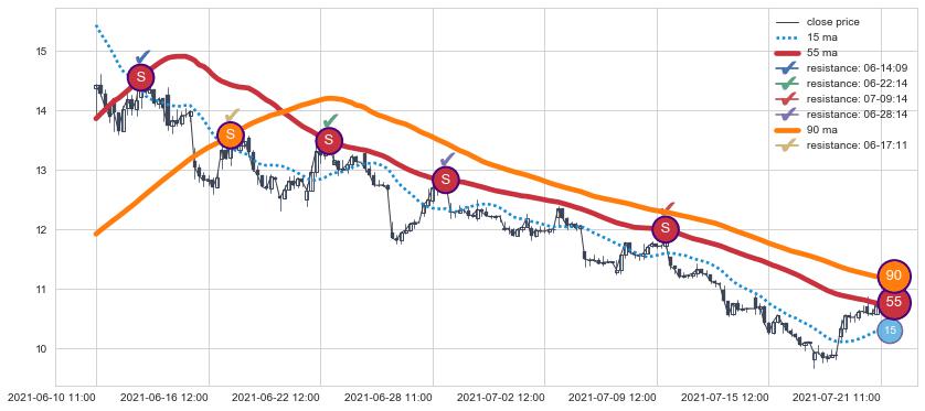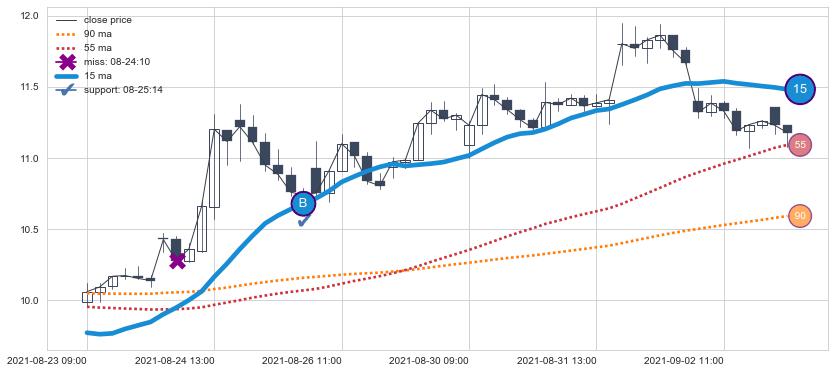 ⚁ MA3和MA8走势平行,且始终保持在短距离内,MA21始终在短中期均线上方,与短中期均线保持一定的距离,微微下行