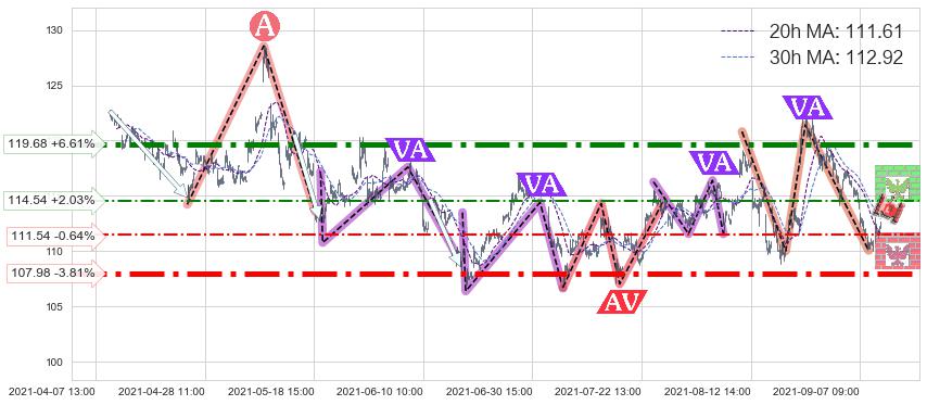 ♞ 20小时均线:111.61,30小时均线:112.92→ 快线<慢线
