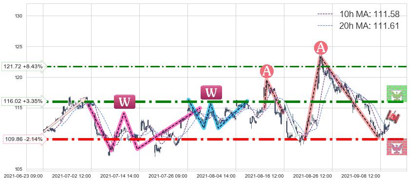 ♘ 阻力价格位116.02,可信任强度87.41%,距离最后交易2021-09-09 14:00形成的收盘价格112.26相差 +3.35%