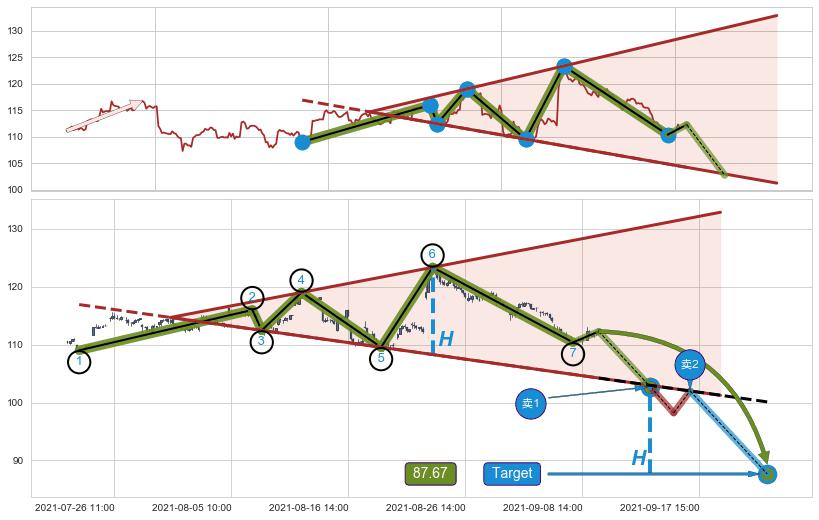 ➢ 最小反转跌幅→𝐇: 15.04 (逐步抬高阻力斜边最后的阻力点⑥与支撑边垂直距离)