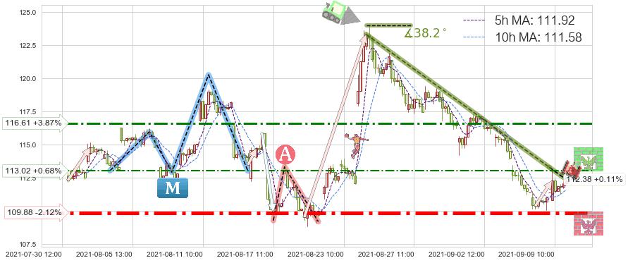 🦴 长线均值回复组合短线趋势跟踪[强阻力信号]2021-08-24 12:00-2021-09-08 15:00下跌趋势依然成立(下跌趋势跟踪依然存在),短线价格略微上行反弹(均值回复猜想),即将接近下跌趋势提供的未破位阻力价格:112.38。