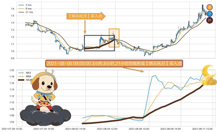 形态多维评估: ⚀ 2021-08-02 13:00:00小时-2021-08-11 10:00:00小时显现 3小时-8小时-21小时均线 【烘云托月】买入点 看多信号,后市看涨,买入