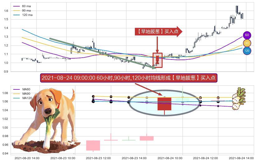 形态多维评估: ⚀ 2021-08-24 09:00:00小时显现 60小时-90小时-120小时均线 【旱地拔葱】买入点 看多信号,后市看涨,买入