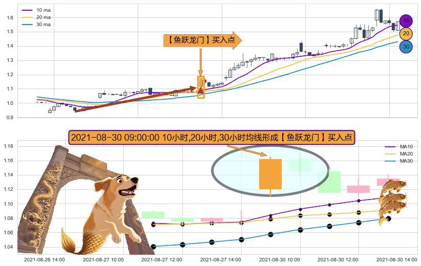形态多维评估: ⚀ 2021-08-30 09:00:00小时显现 10小时-20小时-30小时均线 【鱼跃龙门】买入点 看多信号,后市看涨,买入