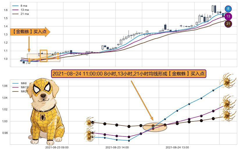 形态多维评估: ⚀ 2021-08-24 11:00:00小时显现 8小时-13小时-21小时均线 【金蜘蛛】买入点 看多信号,后市看涨,买入
