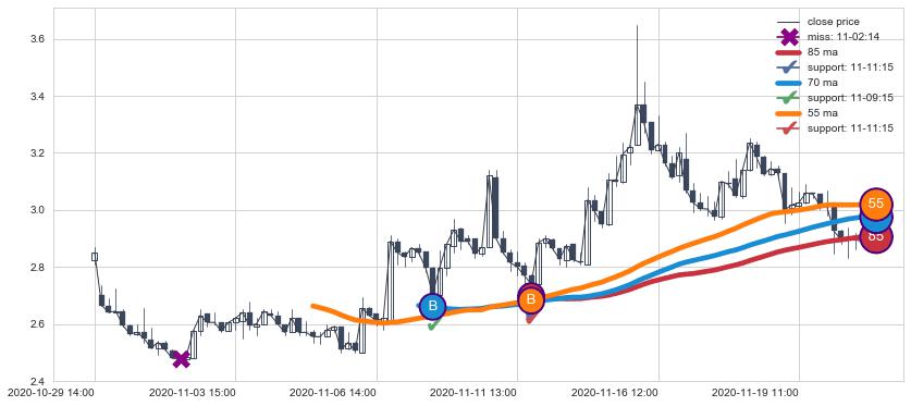 上涨趋势10-29 14:00-11-20 13:00,均线85, 70, 55确认关键支撑2处