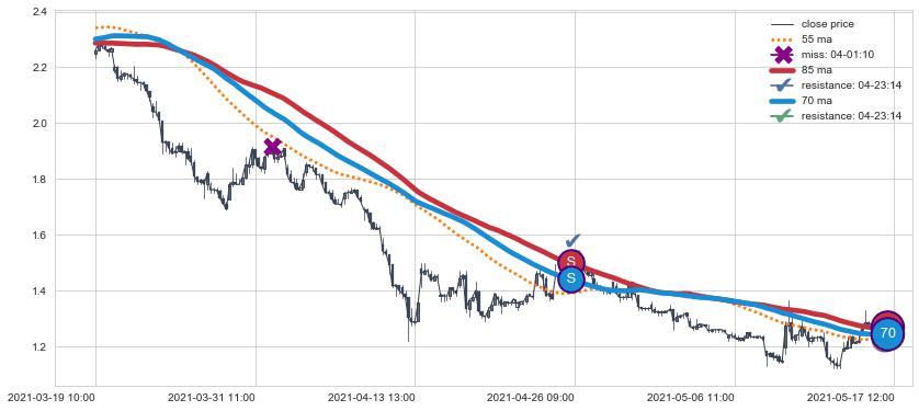 下跌趋势03-19 10:00-05-17 12:00,均线85, 70确认关键阻力1处