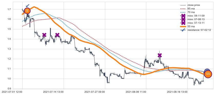 下跌趋势07-01 12:00-08-24 09:00,均线55确认关键阻力1处