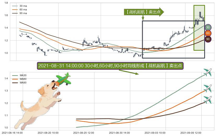 形态多维评估: ⚀ 2021-08-23 14:00:00小时-2021-09-09 14:00:00小时显现 30小时-60小时-90小时均线 【战机起航】卖出点 看空信号,后市看跌,卖出