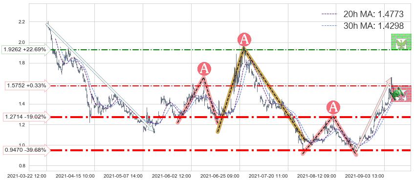 ♘ 阻力价格位1.9262,可信任强度53.90%,距离最后交易2021-09-09 14:00形成的收盘价格1.5700相差 +22.69%