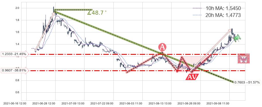 从2021-06-28 11:00至2021-08-25 12:00,共包含249个小时,阶段股价下跌-52.09%,阶段股价变动位移路程比: 1 : 6,下跌趋势角度: 48.7