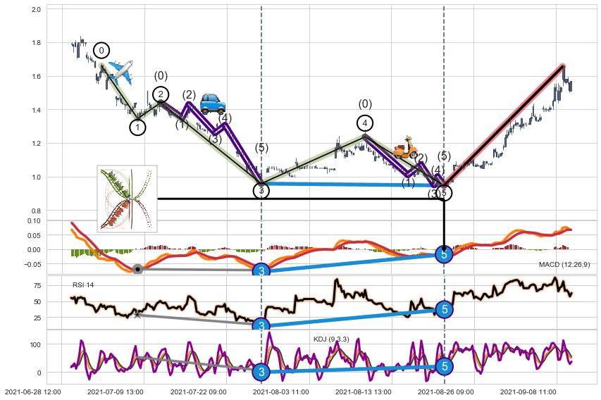 ➣ 1,3,5驱动浪MACD, RSI, KDJ走势都出现【常规背离】反转信号增强