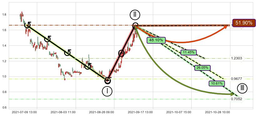 ➣ 调整浪已超过预测的c点位置,但后续大趋势循环浪高概率反转上涨,继续下跌概率48.10%,谨慎做空