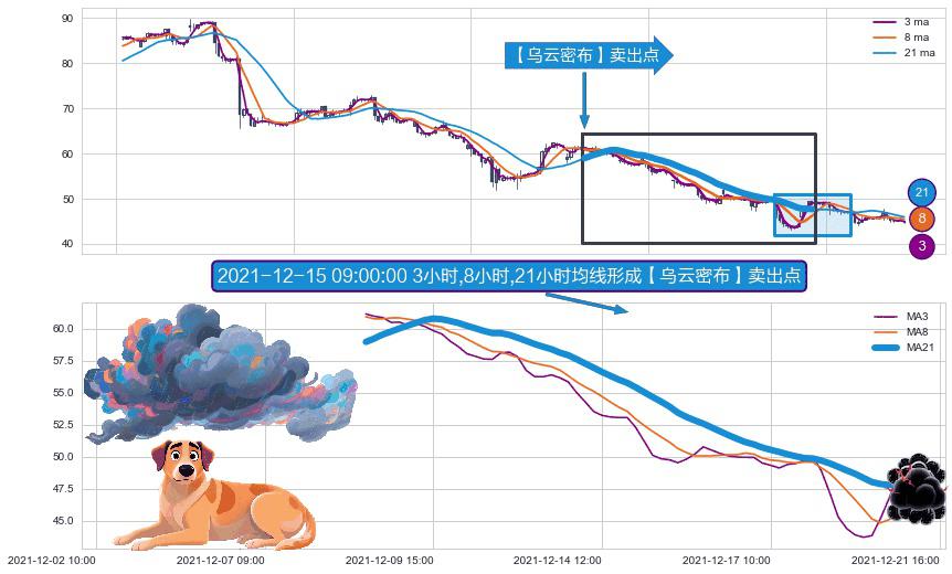 ⚀ 2021-12-08 14:00:00小时-2021-12-21 12:00:00小时显现 3小时-8小时-21小时均线 【乌云密布】卖出点 看空信号,后市看跌,卖出