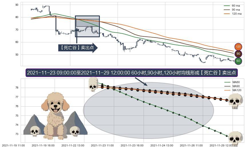 ⚀ 2021-11-23 10:00:00-小时至2021-11-29 12:00:00-小时显现 60小时-90小时-120小时均线 【死亡谷】卖出点 看空信号,后市看跌,卖出