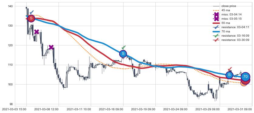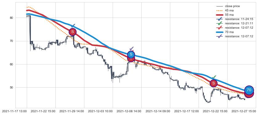⚅ 卖点向下突破均线后,价格走势有持续向下的迹象,但动能稍显不足,迟迟不能远离均线