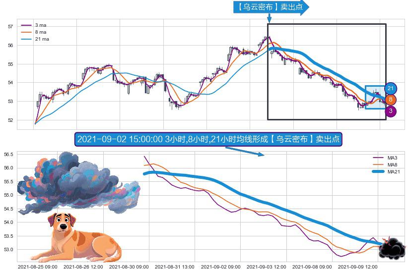 形态多维评估: ⚀ 2021-08-27 14:00:00小时-2021-09-09 14:00:00小时显现 3小时-8小时-21小时均线 【乌云密布】卖出点 看空信号,后市看跌,卖出