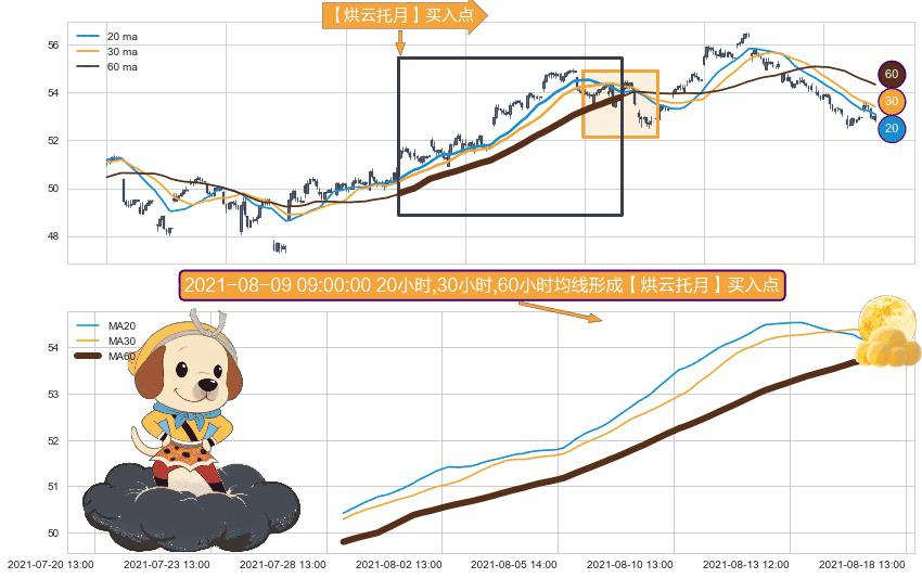 形态多维评估: ⚀ 2021-07-29 10:00:00小时-2021-08-17 14:00:00小时显现 20小时-30小时-60小时均线 【烘云托月】买入点 看多信号,后市看涨,买入