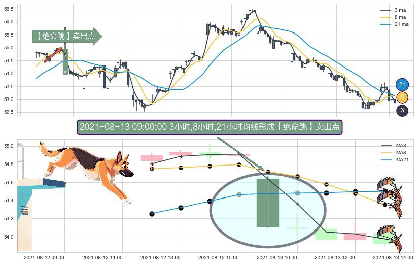 形态多维评估: ⚀ 2021-08-13 09:00:00小时显现 3小时-8小时-21小时均线 【绝命跳】卖出点 看空信号,后市看跌,卖出