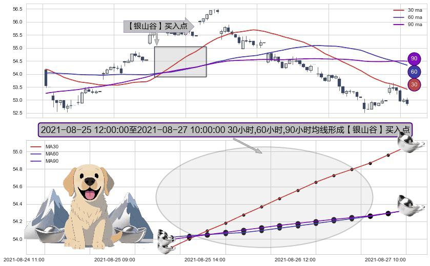 形态多维评估: ⚀ 2021-08-25 13:00:00-小时至2021-08-27 10:00:00-小时显现 30小时-60小时-90小时均线 【银山谷】买入点 看多信号,后市看涨,买入