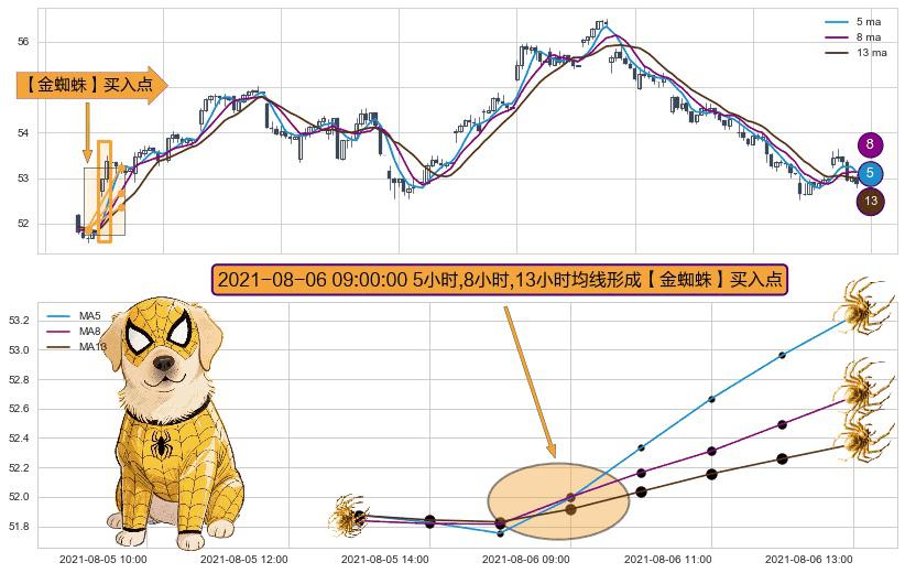形态多维评估: ⚀ 2021-08-06 09:00:00小时显现 5小时-8小时-13小时均线 【金蜘蛛】买入点 看多信号,后市看涨,买入