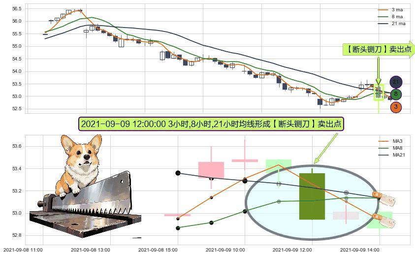 形态多维评估: ⚀ 2021-09-09 12:00:00小时显现 3小时-8小时-21小时均线 【断头铡刀】卖出点 看空信号,后市看跌,卖出