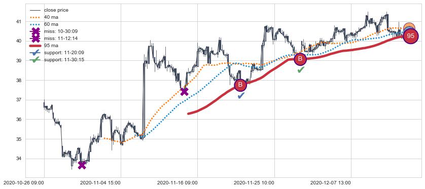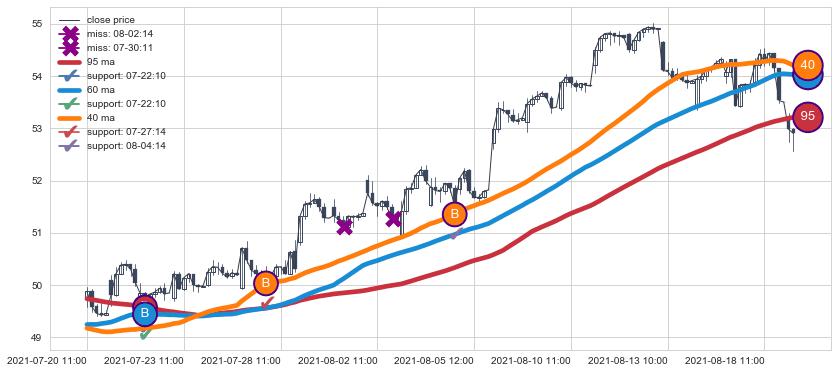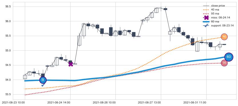 上涨趋势07-20 11:00-08-19 10:00,均线40, 60, 95确认关键支撑3处