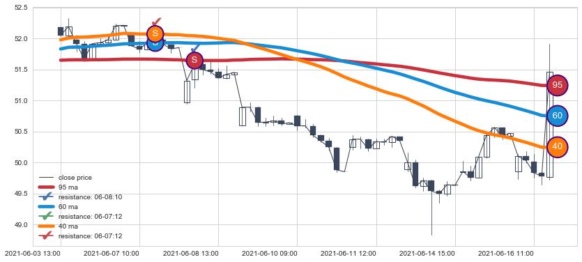 下跌趋势06-03 13:00-06-16 13:00,均线40, 60, 95确认关键阻力2处