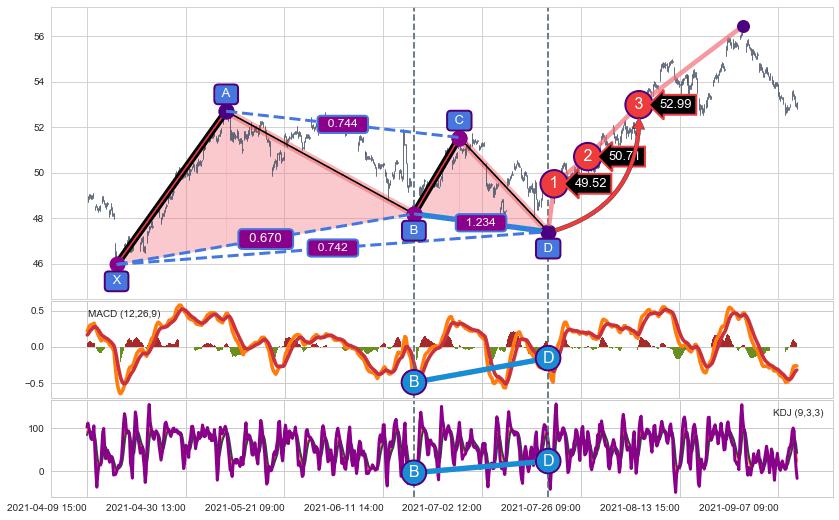 ➢ 谐波价格D点比B点低 ⤵,【KDJ】指标D点比B点高 ⤴️