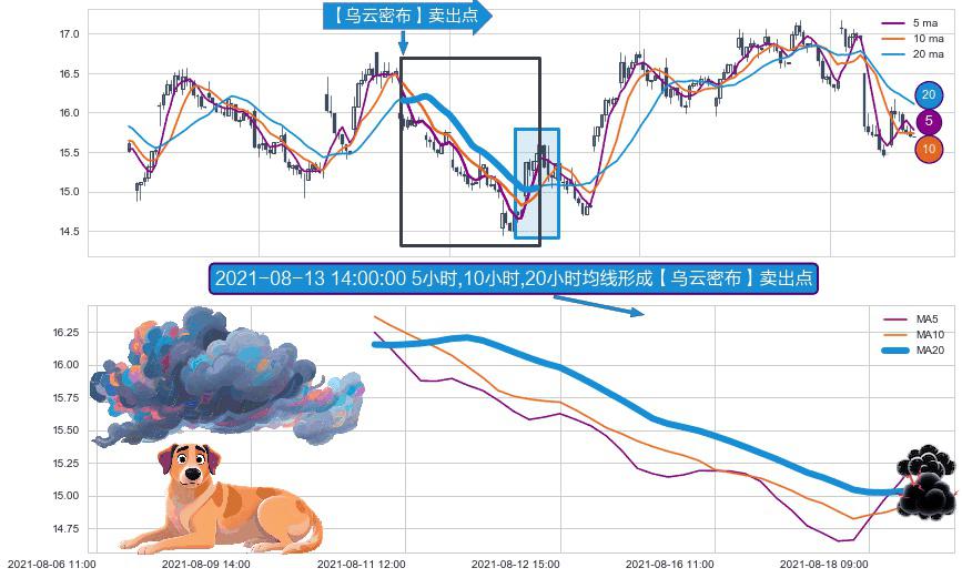 形态多维评估: ⚀ 2021-08-11 10:00:00小时-2021-08-18 12:00:00小时显现 5小时-10小时-20小时均线 【乌云密布】卖出点 看空信号,后市看跌,卖出