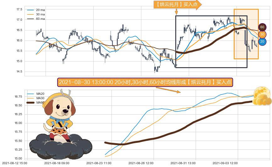 形态多维评估: ⚀ 2021-08-20 14:00:00小时-2021-09-08 10:00:00小时显现 20小时-30小时-60小时均线 【烘云托月】买入点 看多信号,后市看涨,买入
