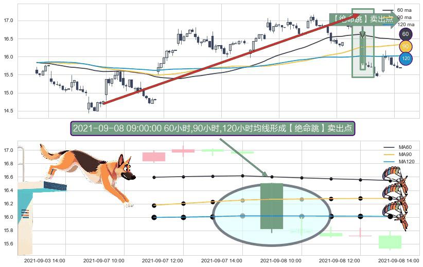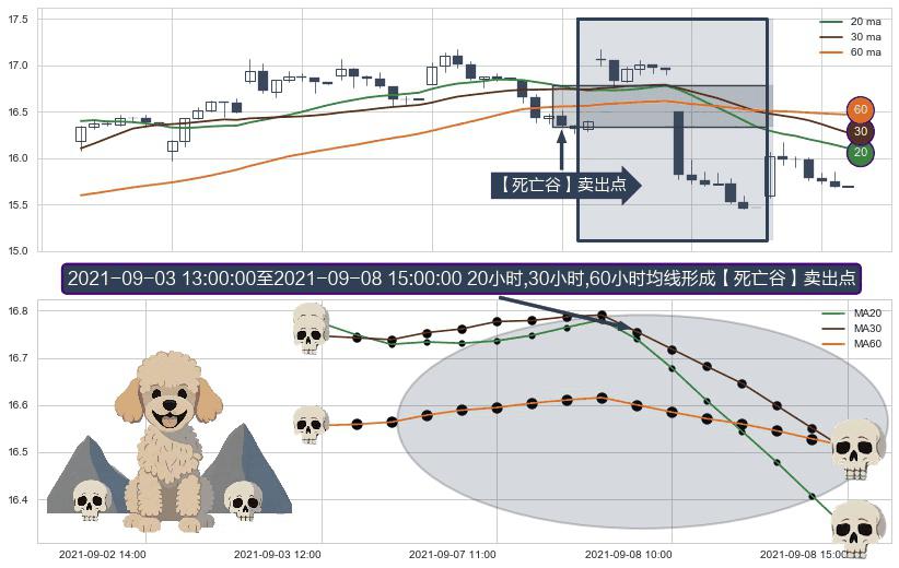 形态多维评估: ⚀ 2021-09-03 14:00:00-小时至2021-09-08 15:00:00-小时显现 20小时-30小时-60小时均线 【死亡谷】卖出点 看空信号,后市看跌,卖出