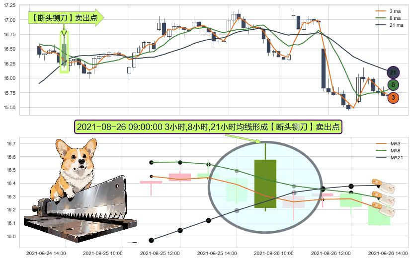 形态多维评估: ⚀ 2021-08-26 09:00:00小时显现 3小时-8小时-21小时均线 【断头铡刀】卖出点 看空信号,后市看跌,卖出
