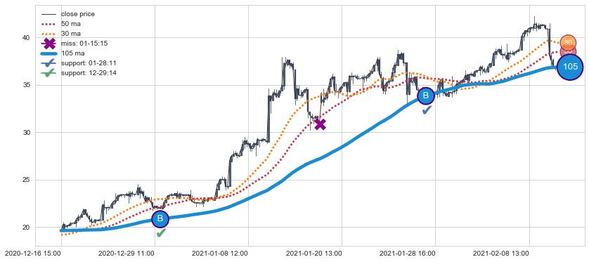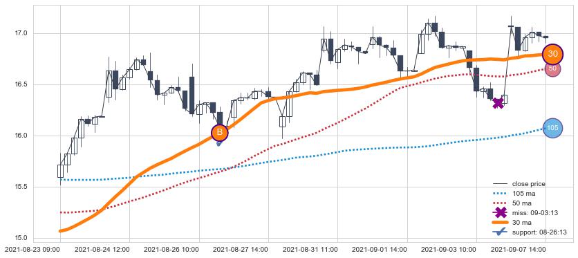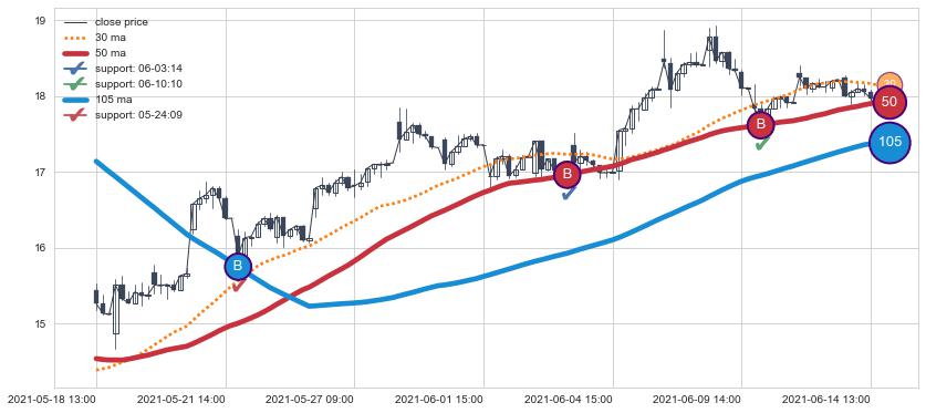 上涨趋势05-18 13:00-06-14 14:00,均线105, 50确认关键支撑3处