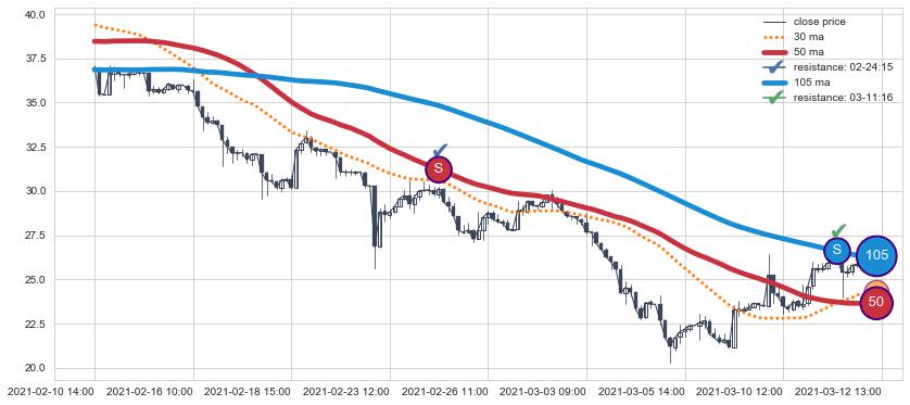 下跌趋势02-10 14:00-03-12 13:00,均线105, 50确认关键阻力2处