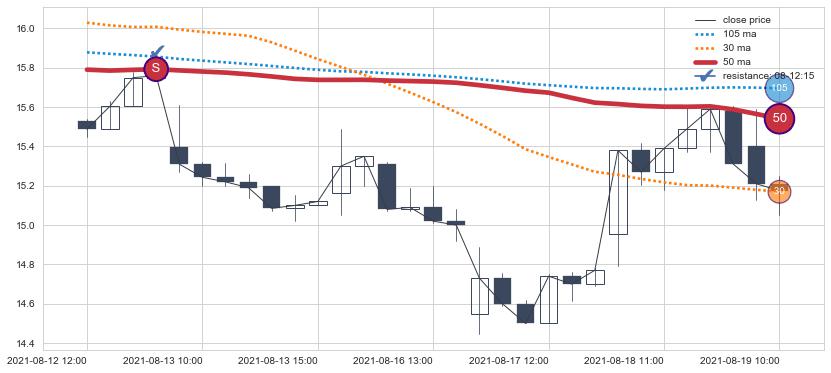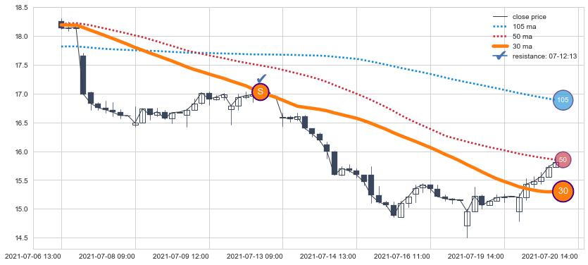 下跌趋势07-06 13:00-07-20 14:00,均线30确认关键阻力1处