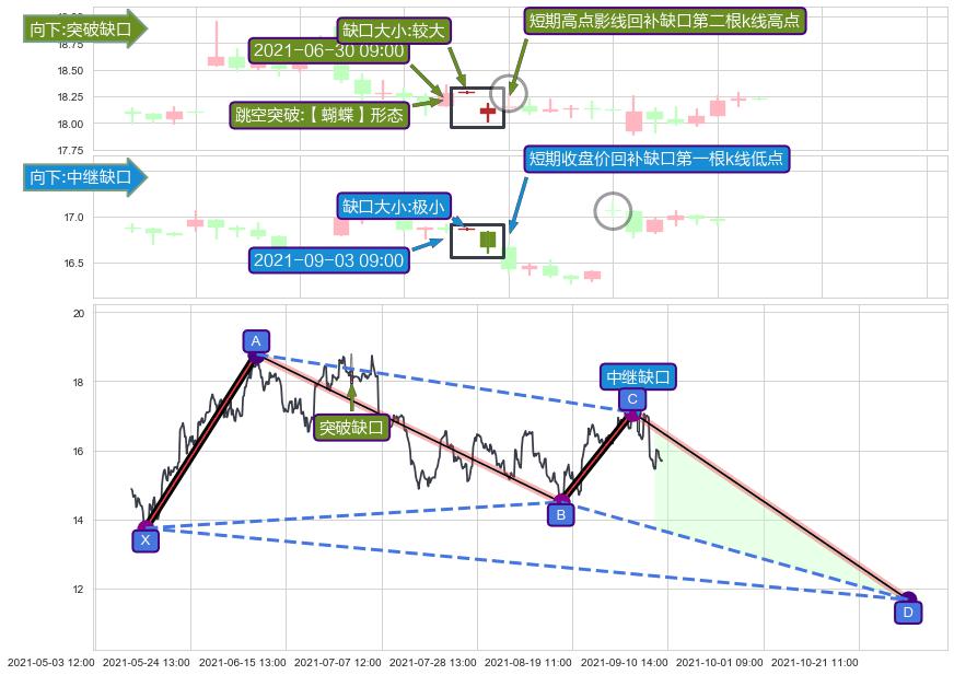 ➣ 突破缺口形成后,后续k已经超过14根,跳空突破【蝴蝶】形态关键点后, 出现【轻微回踩】迹象,短期高点影线回补缺口第二根k线高点