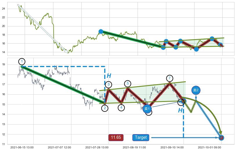 ➣ 最小中继整理跌幅→𝐇: 2.395 (上平行阻力线与下平行支撑线的垂直距离)