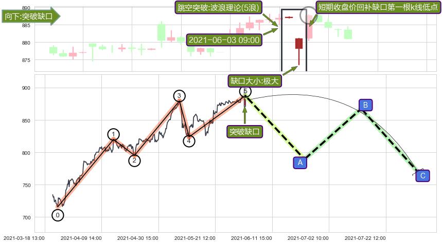 ➣ 突破缺口形成后,后续k不足7根,跳空突破波浪理论(5浪)关键点后, 出现【完全回踩】迹象,短期收盘价回补缺口第一根k线低点