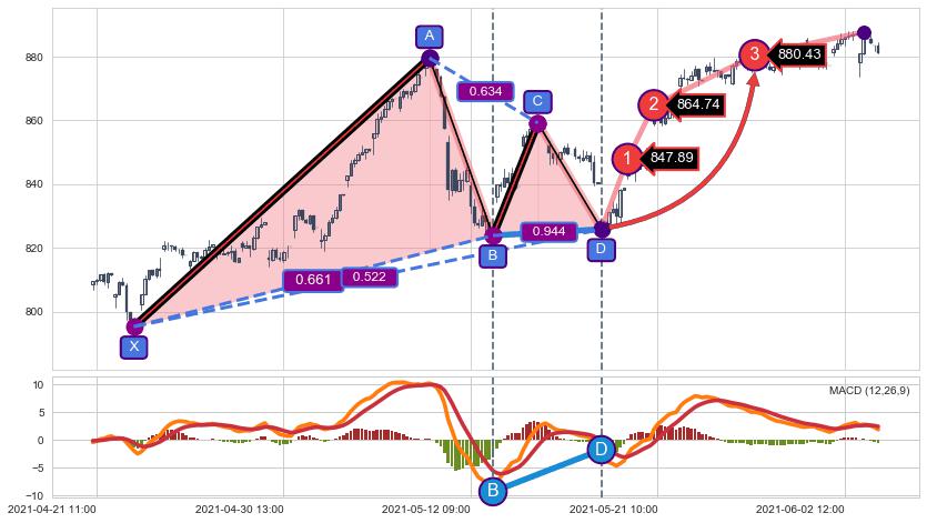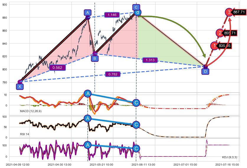 ➣ D点拟合预测价格803.95,距离最后交易收盘价格880.90相差 -8.74%