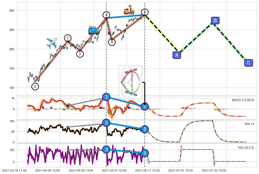 ➣ 1,3,5驱动浪MACD, RSI, KDJ走势都出现【常规背离】反转信号增强