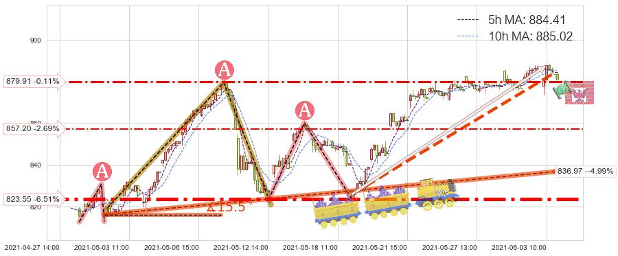 ♞ 5小时均线:884.41,10小时均线:885.02→ 快线<慢线
