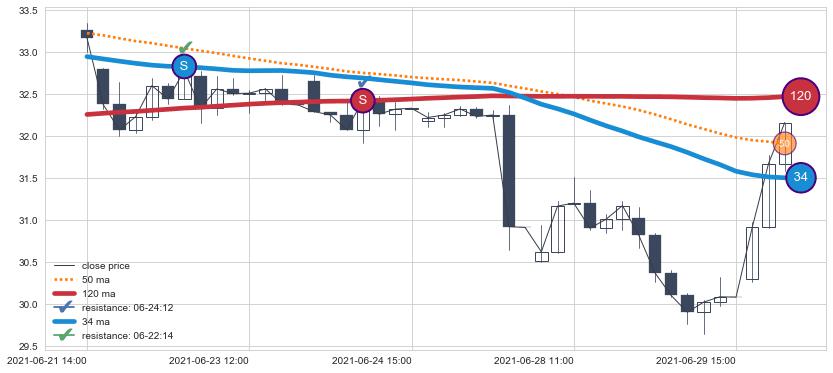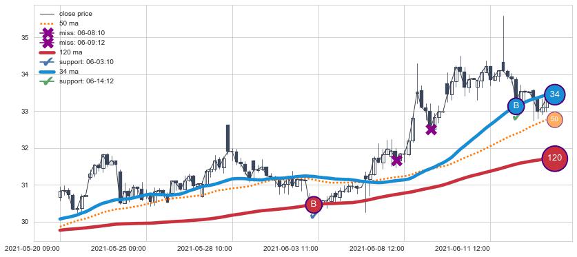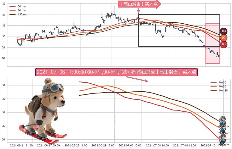 ⚀ 2021-06-21 13:00:00小时-2021-07-19 14:00:00小时显现 60小时-90小时-120小时均线 【高山滑雪】买入点 看多信号,后市看涨,买入