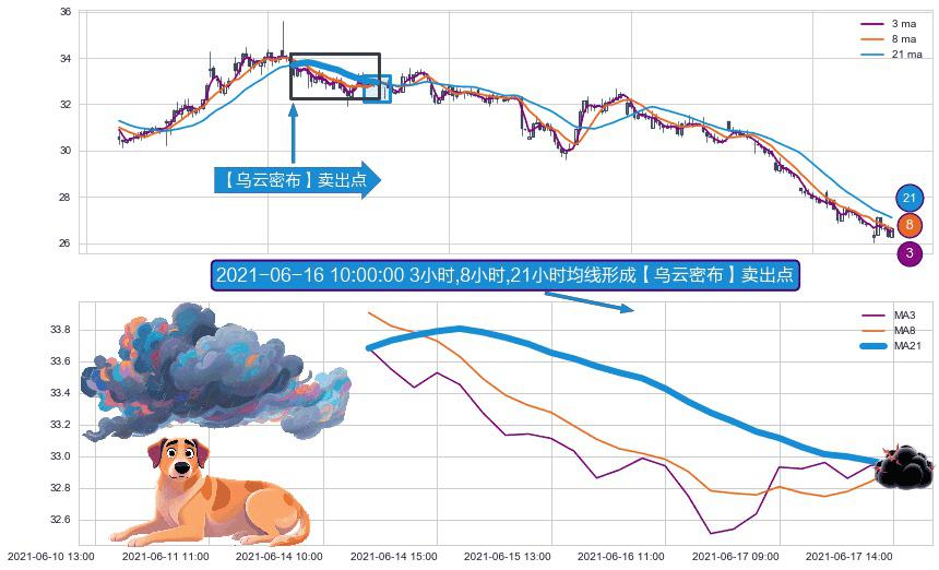 ⚀ 2021-06-14 12:00:00小时-2021-06-17 14:00:00小时显现 3小时-8小时-21小时均线 【乌云密布】卖出点 看空信号,后市看跌,卖出