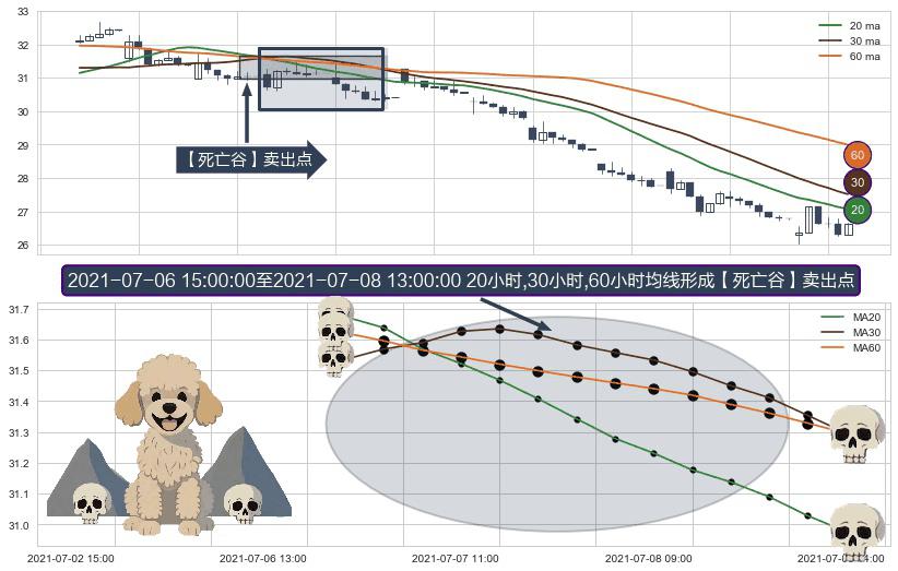⚀ 2021-07-07 09:00:00-小时至2021-07-08 13:00:00-小时显现 20小时-30小时-60小时均线 【死亡谷】卖出点 看空信号,后市看跌,卖出
