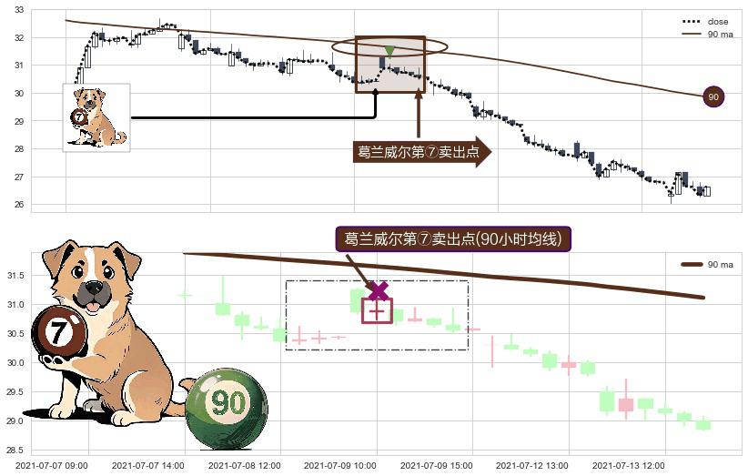 ⚀ 2021-07-09 10:00:00-小时显现 葛兰威尔均线 90小时均线 第⑦卖出点 下降趋势的中继信号,后市看跌,卖出信号
