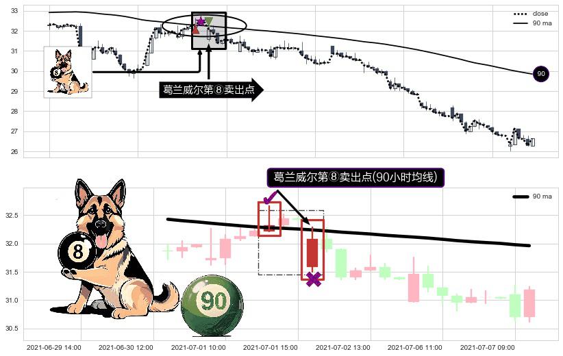 ⚀ 2021-07-02 09:00:00-小时显现 葛兰威尔均线 90小时均线 第⑧卖出点 下降趋势的中继信号,后市看跌,卖出信号